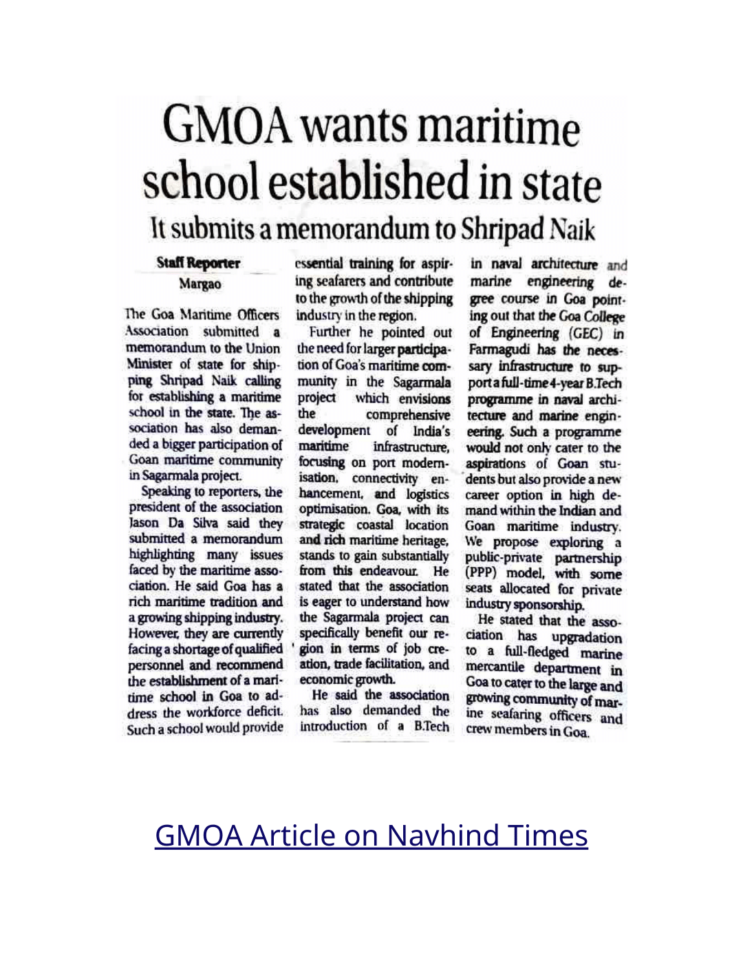 GMOA Article on Navhind Times